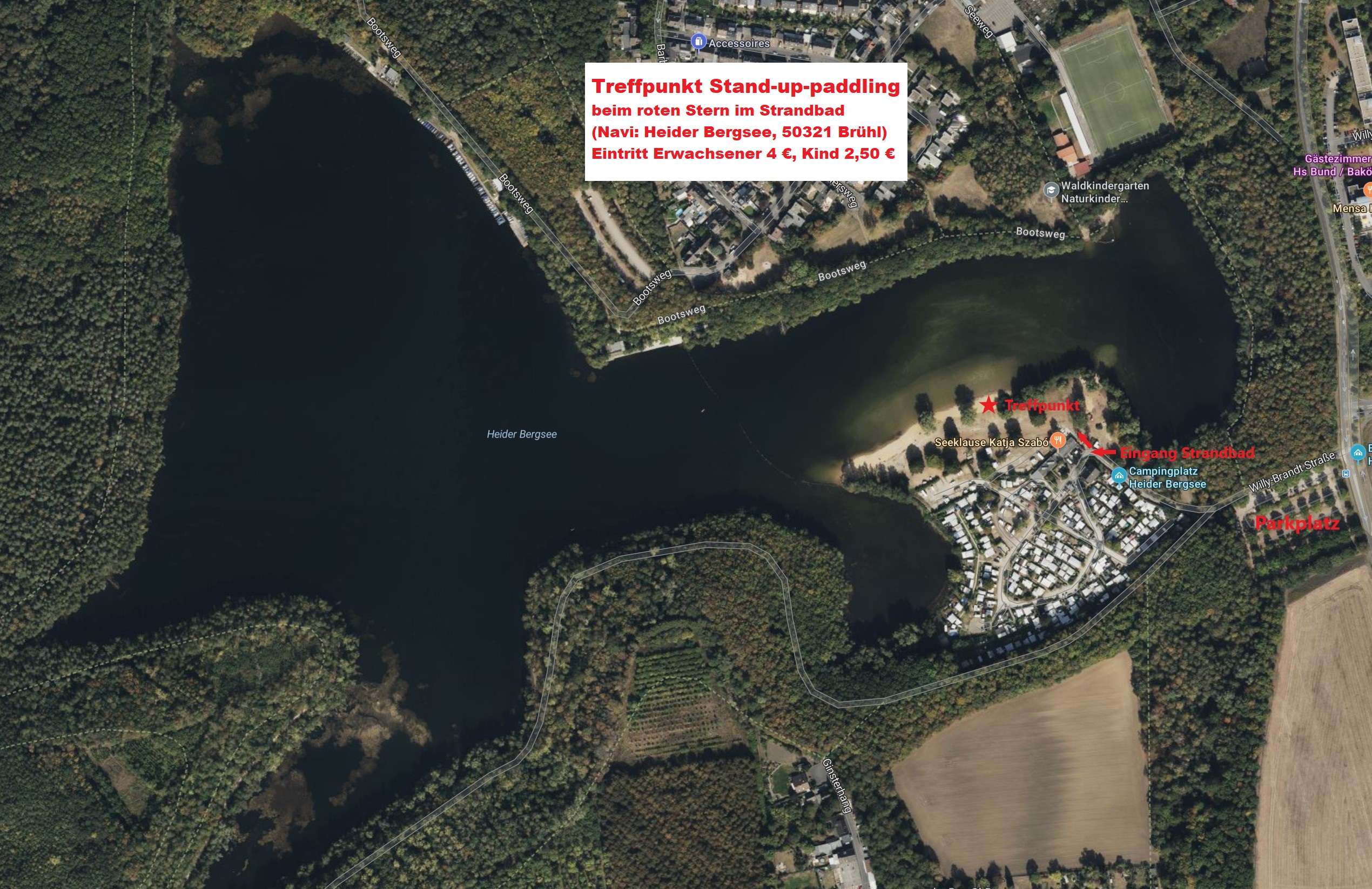 Kursort ist der Heider Bergsee in Köln. Der Treffpunkt ist am Ufer im Strandbad (roter Stern auf der beiliegenden Karte). Der Eintritt ins Strandbad kostet zusätzlich 4 € pro Erwachsenen und 2,50 € pro Kind. Dafür bietet das Bad aber einen schönen Sandstrand und man kann dort in der Nähe des Eingangs auch etwas zum Essen und Trinken kaufen.